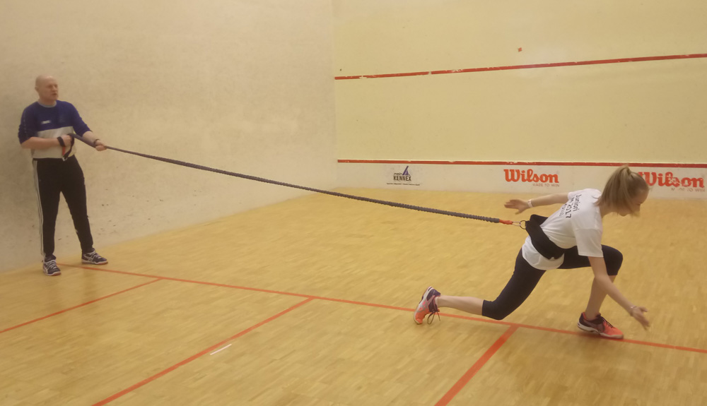 Squash-Kuopio hankki joustokumin keskivartalolihasten hallinntaan ja parantamiseen. Kumi on vahva ja päällystetty joustavalla kankaalla. Kumin toisessa päässä on vyö, joka kiinnitetään pelaajan vyötärölle. Valmentaja seisoo sopivassa kohdin ja pitää kumin toisesta päästä kiinni. Pelaaja suorittaa liikkumisharjoituksia eri lyöntipisteisiin, jolloin kumi vastustaa liikettä.