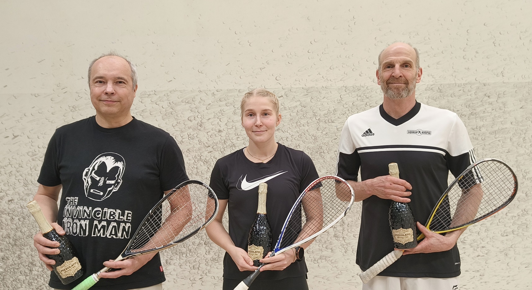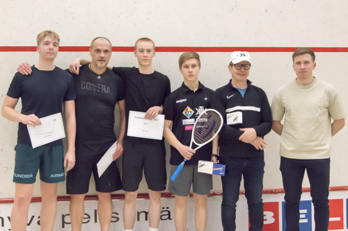 Kuvassa oikealla Juho Kallio, Joni Kuosmanen ja Aapo Randelin. Keskellä kultaa voittanut ESRC:n joukkue ja oikealla hopealle sijoittunut Squash Nallen tyttöjoukkue.