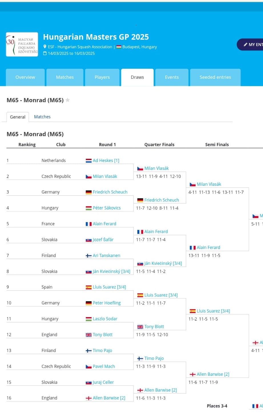 Timo ja Ari osallistuivat 14.-15.3.2025 Budapestissa pidetyissä seniorien squashkilpailuihin. Timo oli sarjan a 65 v viides. Pelaajia oli saapunut useista Euroopan maista.