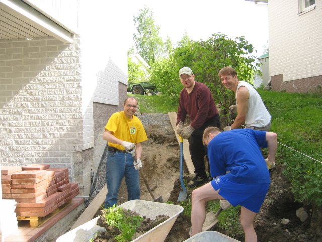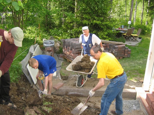 Kevätkauden päättäjäisiä vietettiin kesäisissä merkeissä; kaivettiin maata, kannettiin tiiliä ja siirrettiin sepeliä. Seuramme junioriohjaajalla Arilla on menossa pihaprojekti. Pelikavereita oli saapunut auttamaan ja samalla suorittamaan päivän kuntoiluohjelmansa. Työ sujui hyvässä kesäsäässä ripeästi ja rattoisasti. Tankattiin evästä ja nestettä. Ennen saunaan menoa tietysti pelattiin - tällä kertaa rantalentopalloa.