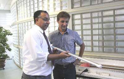 Sami Abdelhamid (vas.)ja FinnEnergian toimitusjohtaja Hannu Partanen esittelevät uutta led-putkea.