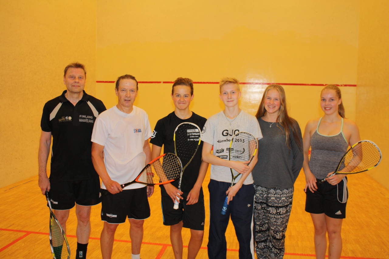 Timo Pajo ja Ari Tanskanen ovat lähdössä elokuun lopulla pidettäviin European Masters kilpailuihin (seniorien EM-kilpailut). Heitä olivat sopivasti sparraamassa SqK:n Ville Koskinen sekä porilaiset vieraat Atte ja Kamilla Stengård sekä Viola Joutsi. Ville ja Atte ovat Suomen ykköspelaajat P15 sarjassa ja edustivat mm Suomea EM-kilpailuissa. Ville ja vieraat osallistuvat elokuun lopulla Helsingissä pidettäviin Finnish Junior Openiin.