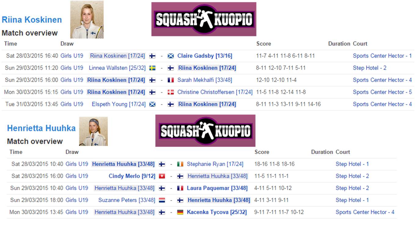 Juniorien u19 squashin EM-kisat pidetään Prahassa 28.3. - 5.4. Riina ja Henrietta osallistuvat ensin tyttöjen henkilökohtaisiin sarjoihin. Lisäksi tyttöjen sarjaan osallistuvat Nea Falck ja Maarit Ekholm. Pojista Suomea edustavat Jami ja Miko Äijänen.