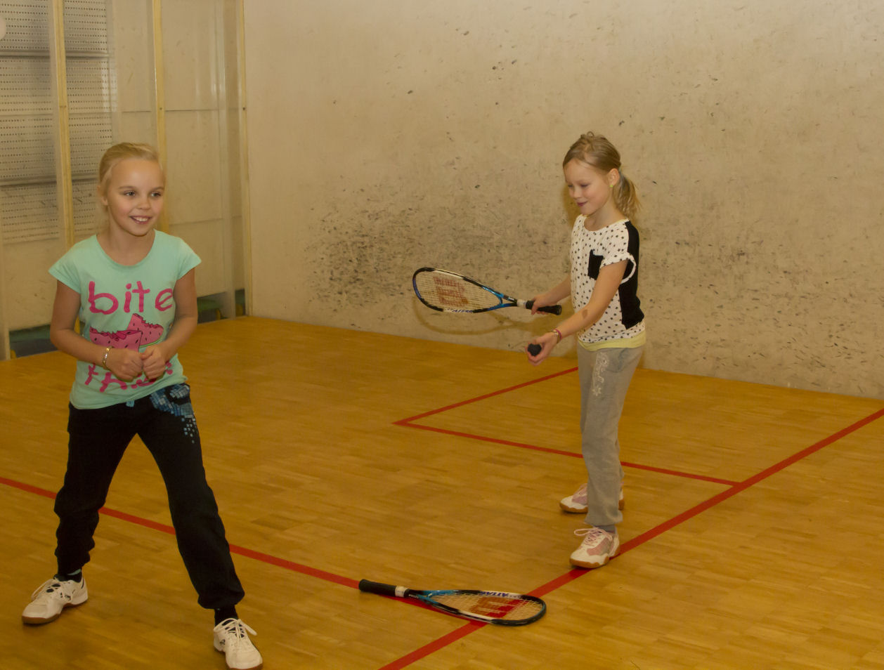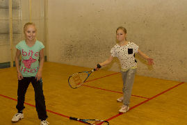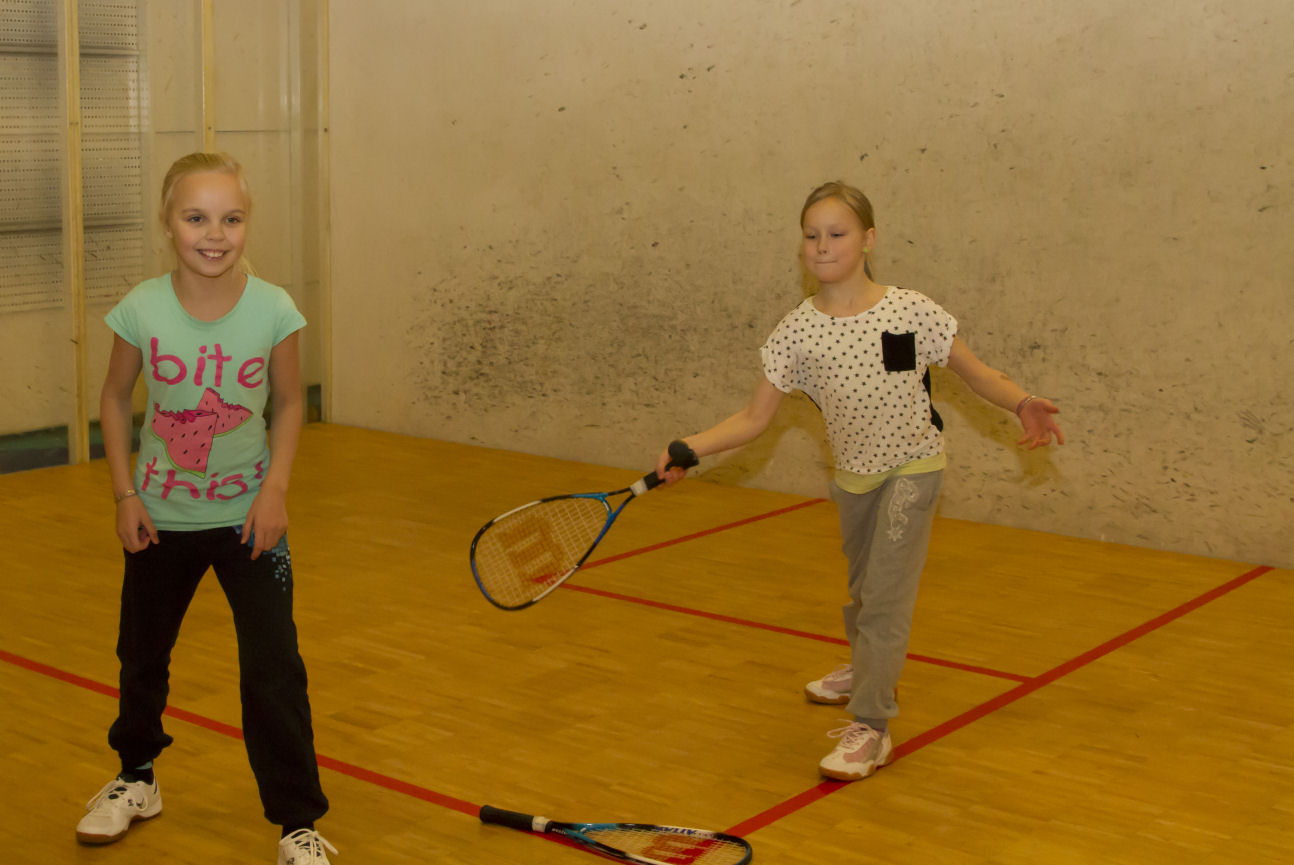 Kaverukset Maria ja Elli ovat nyt harjoitelleet muutaman kerran ja otteet ovat hyvät. Jenna halusi seurata isänsä jalan jälkiä ja tutustua squashiin. Jennan taipumukset ovat myös hyvät.