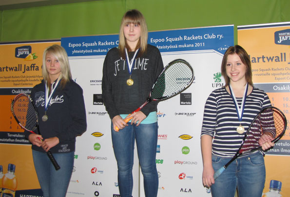 T15-sarjassa oli ilahduttavasti 3 edustajaa SqK:sta. Riina otti kultamitalin selkeästi häviämättä erääkään. Voitto oli odotettu, vaikka ESRC:n Nea Falck onkin viime aikoina pelannut hyvin Riinan kanssa. Loistava suoritus oli myös Hetan menestys, 5. sija. Hetta taisteli hyvät 3 - 2 voitot ESRC:n Sofia Korpeisesta ja Katri Aalto-Setälästä. Amandalla oli myös hyvä turnaus. 2 - 3 tappio Jenni Heikkilälle oli pienestä kiinni. 5. eräkin päättyi 9/11.